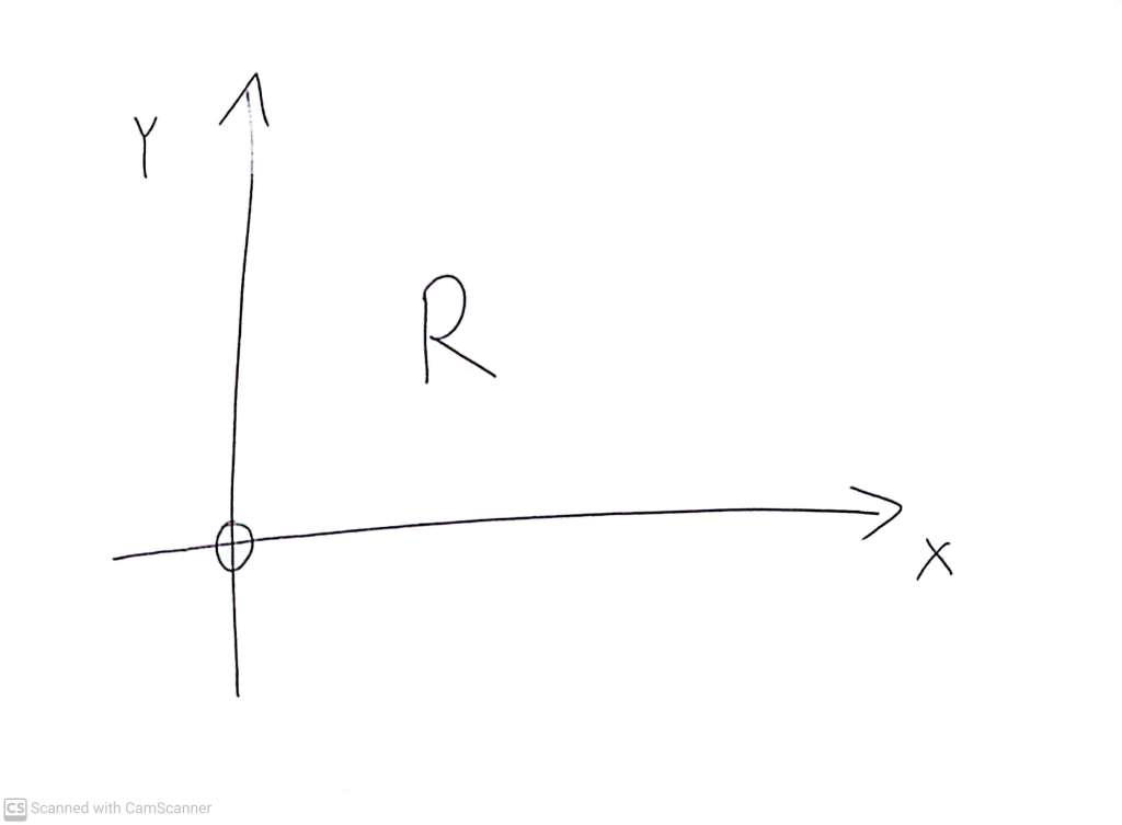 Here is a shape, the letter R, drawn in an X-Y coordinate system with the origin (the point where X=0 and Y=0) at the intersection of the drawn axes, and the ‘positive’ direction of each axis being the one which has the arrow.