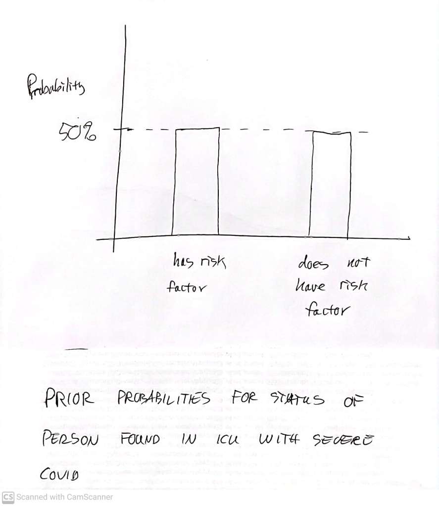 Let’s repeat the reasoning with our steps a little more aligned to the usual language of “Bayes’ Theorem“. We have the prior state of our knowledge being that 1% of people have the risk factor – so if you just pick a person from the population, giving everyone an equal chance of being chosen, then the probability of this person having the severe covid disease risk factor is 1% (Prob = 0.01):