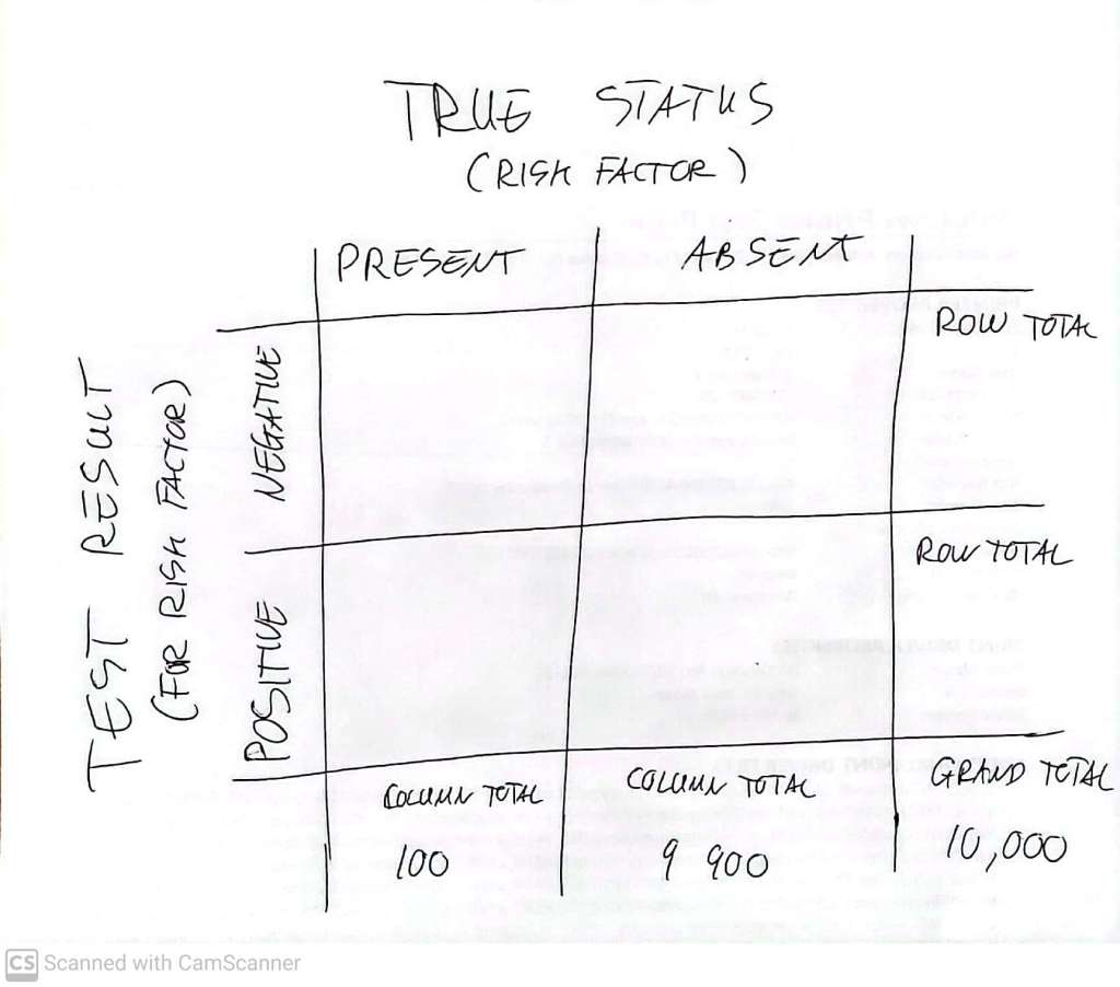 Work out the details of the simple diagnostic scenario described above: Fill in the blocks in the “2 by 2” (2X2) ‘Contingency table’.